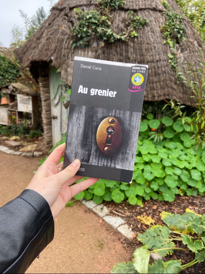 J’ai choisi la couverture du roman Au grenier de Daniel Cario. Cette couverture est sobre. On y voit une serrure avec un oeil qui observe le lecteur.